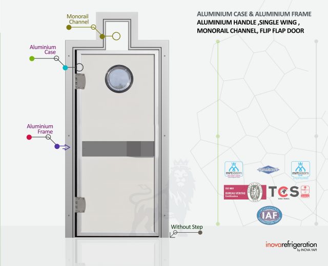 Door bumper plate: Aluminum or Pvc Thick absorber materials applied on the inside or outside of the door on the lower parts of the door in frequently used & impacted areas are called bumper. Bumpers are available as optional in cold room doors. In addition to aluminum material or PVC plate absorbers, stainless steel 304 quality thick sheet application can be made.