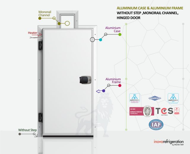 Door bumper plate: Aluminum or PVC  Thick  absorber materials applied on the inside or outside of the door on the lower parts of the door in frequently used & impacted areas are called bumper . bumpers  are available as optional in cold room doors . In addition to aluminum material or PVC plate absorbers , stainless steel 304 quality thick sheet application can be made