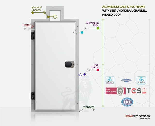 Door Front Frame: In accordance with the working principles of Cold Storage, they are produced in maximum quality at aesthetic, ergonomic & flexible to be used at +80 ° C – 60 ° C. It’s designed with 100% German technology at doors with negative & positive values. It’s made of PVC raw material imported from 1st class quality according to European norms. Cold room door frame is so strong that screw buldeks & bolt are applicat easily on the surface. The monorail channel is in the upper part of the front. It’s applied as standard in the middle of the door. According to the monorail system located in the area where the door will be installed, a monorail channel can be opened with the special production technique.