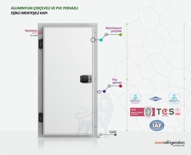 Kapı Ön Pervazları: Soğuk Hava Depolarının çalışma prensiplerine uygun olarak +80 C° / – 60 C° derecede kullanılacak şekilde, estetik,ergonomik ve esnek olarak maksimum mukavemette üretilmektedir. -°C negatif ve + °C pozitif değerlerde kullanılacak kapılarda % 100 alman teknolojisi ile tasarlanmış Avrupa normlarında ithal 1.sınıf kalitede pvc hammaddeden üretilmiş, sıfır iletkenlik özelliği sayesinde kapı etrafında buzlanmayı önleyen plastik görünümlü dizayn edilen kapı pervazı sistemine sahiptir. Rahatlıkla üzerine vida, civata, buldeks vida uygulaması üzerine yapılabilen mukavemettedir.