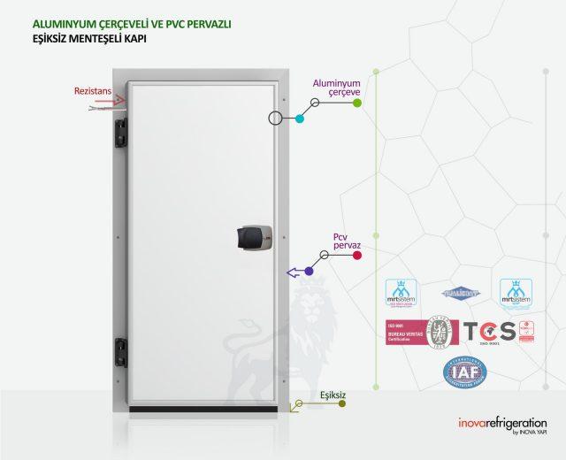 Kapı Ön Pervazları: Soğuk Hava Depolarının çalışma prensiplerine uygun olarak +80 C° / – 60 C° derecede kullanılacak şekilde, estetik,ergonomik ve esnek olarak maksimum mukavemette üretilmektedir. -°C negatif ve + °C pozitif değerlerde kullanılacak kapılarda % 100 alman teknolojisi ile tasarlanmış Avrupa normlarında ithal 1.sınıf kalitede pvc hammaddeden üretilmiş, sıfır iletkenlik özelliği sayesinde kapı etrafında buzlanmayı önleyen plastik görünümlü dizayn edilen kapı pervazı sistemine sahiptir. Rahatlıkla üzerine vida, civata, buldeks vida uygulaması üzerine yapılabilen mukavemettedir.